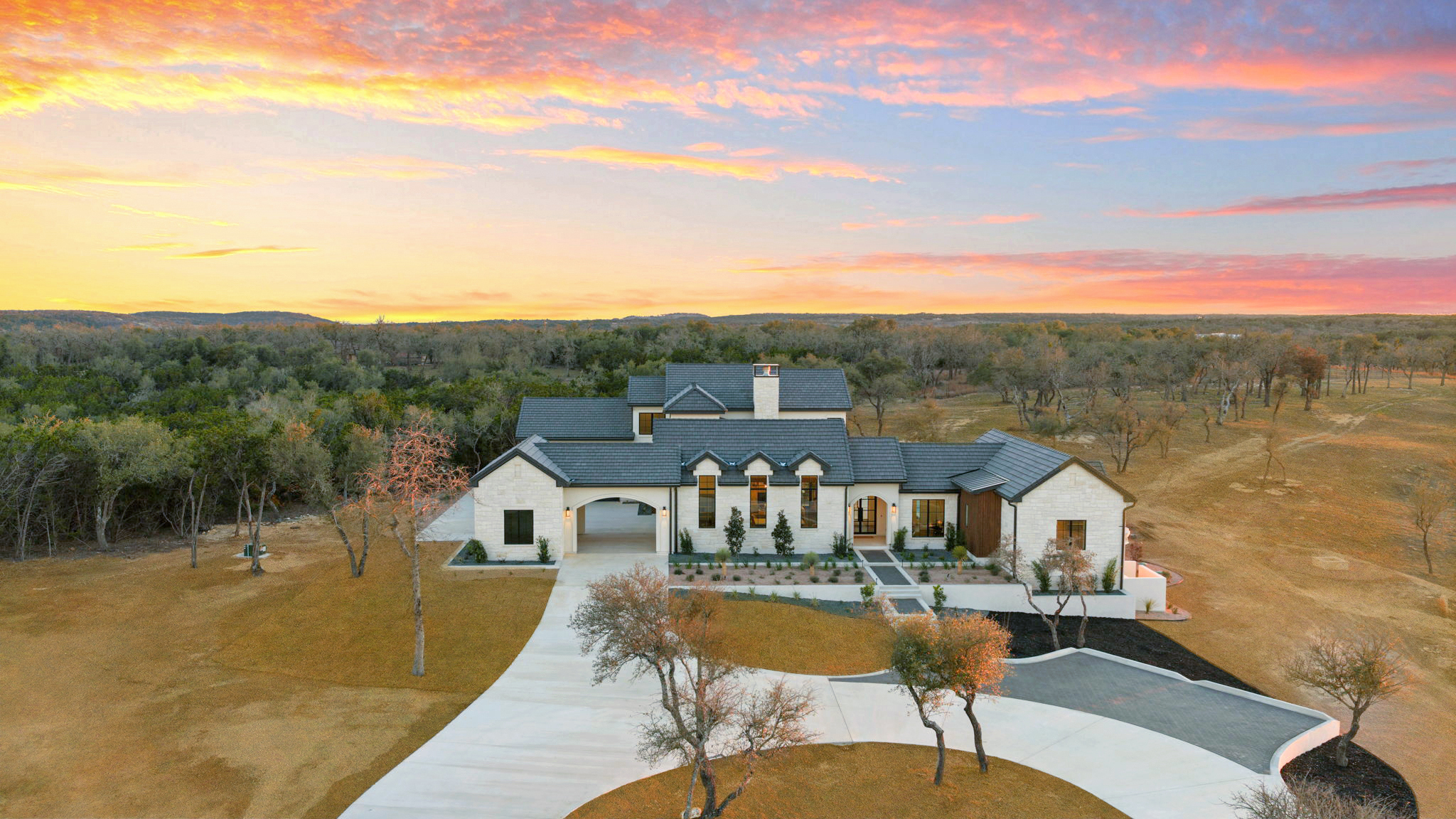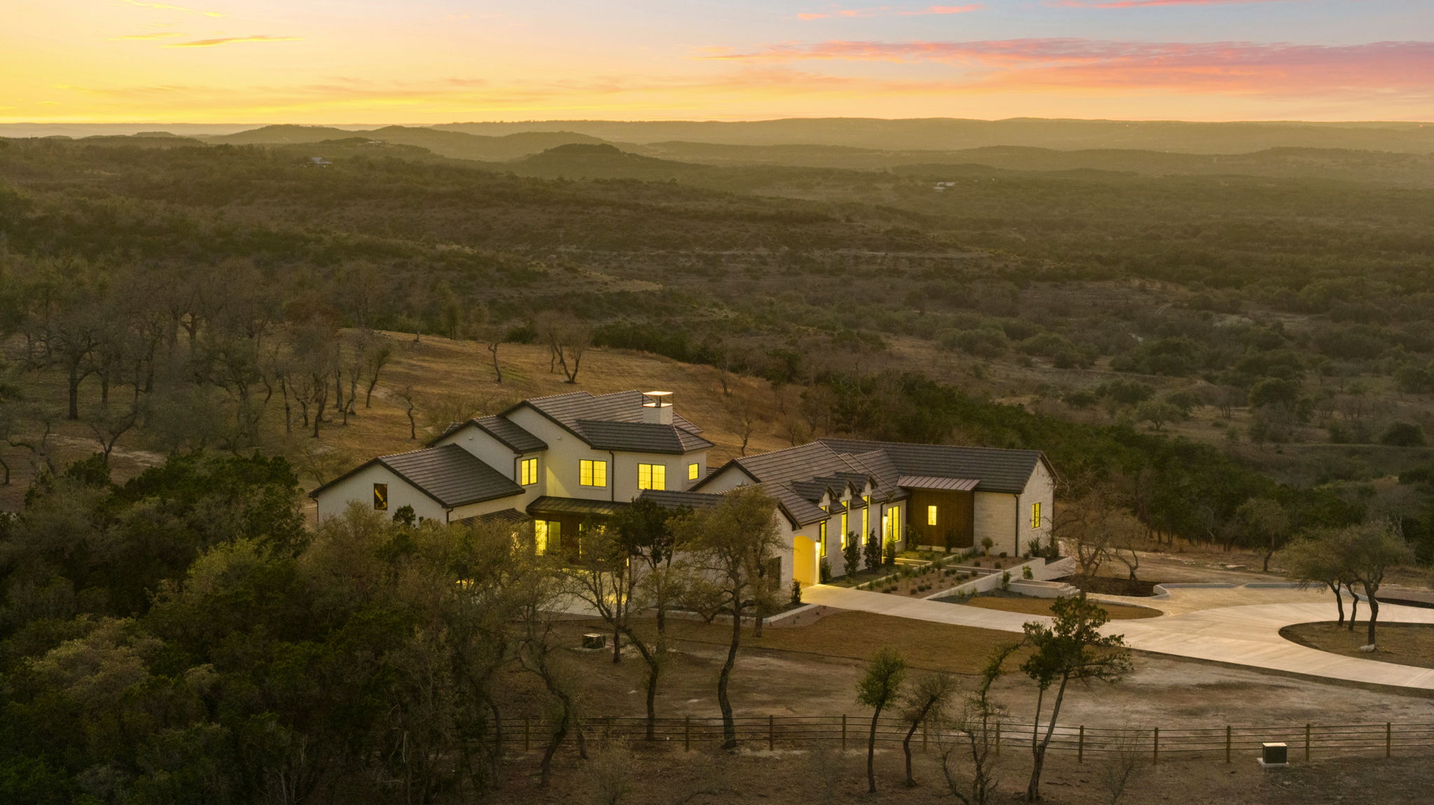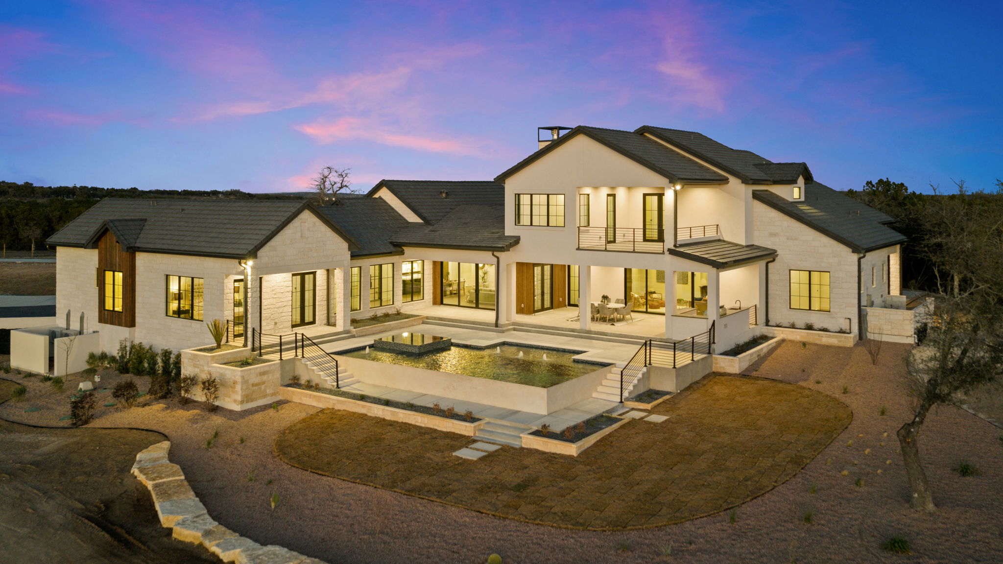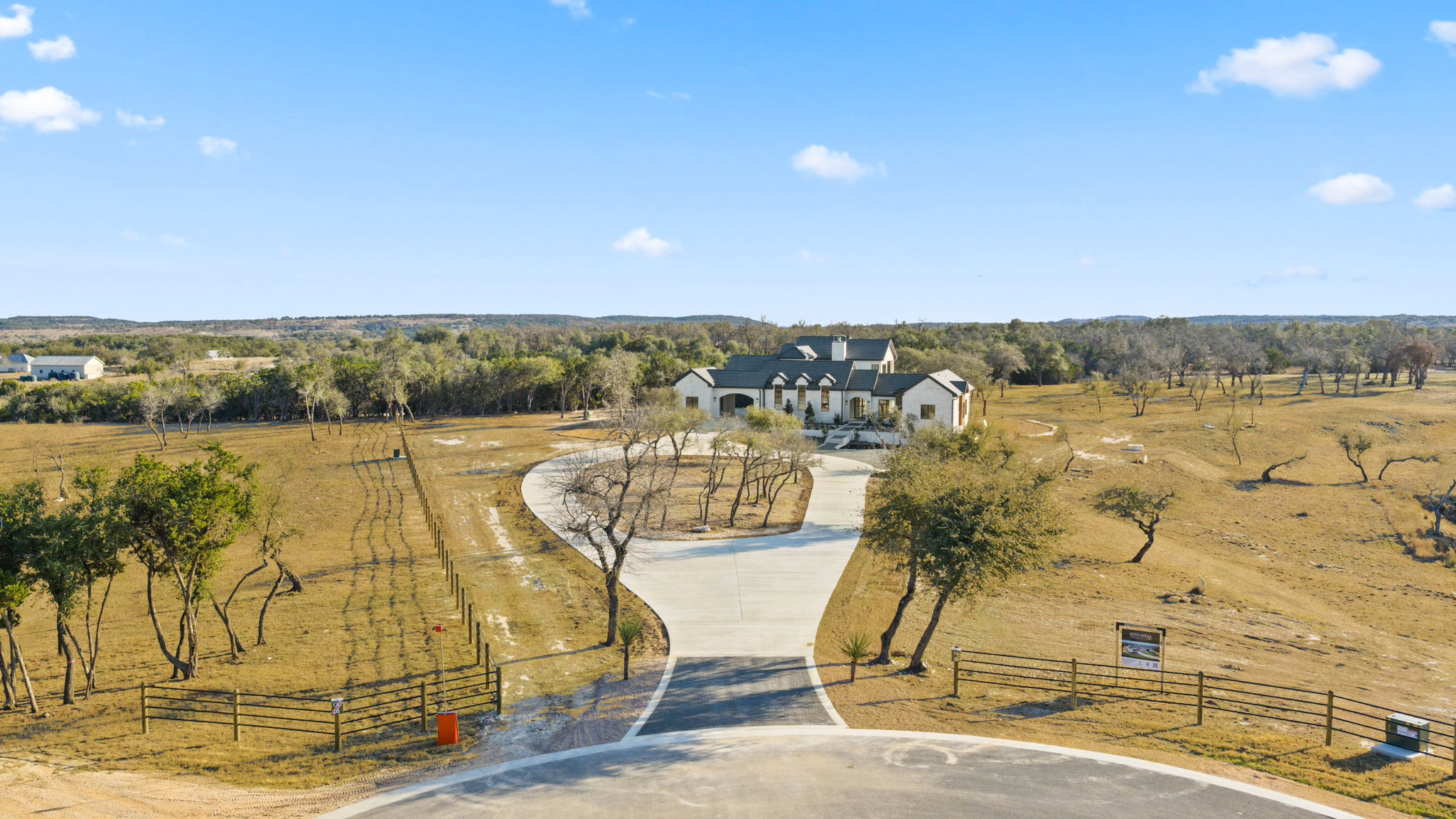 Nestled amid iconic Texas landscapes, this expansive estate harmoniously embraces its surroundings—offering panoramic epic views, sweeping open spaces, a tranquil grotto, and the gentle whisper of a seasonal creek.