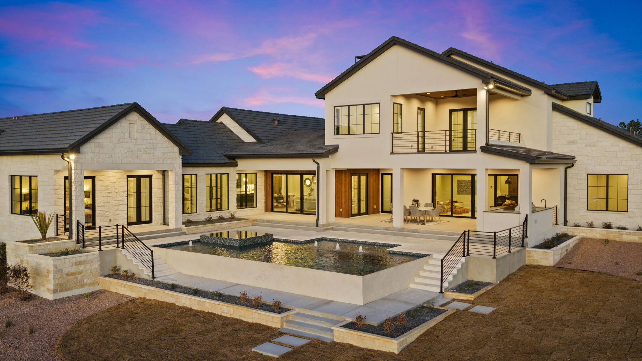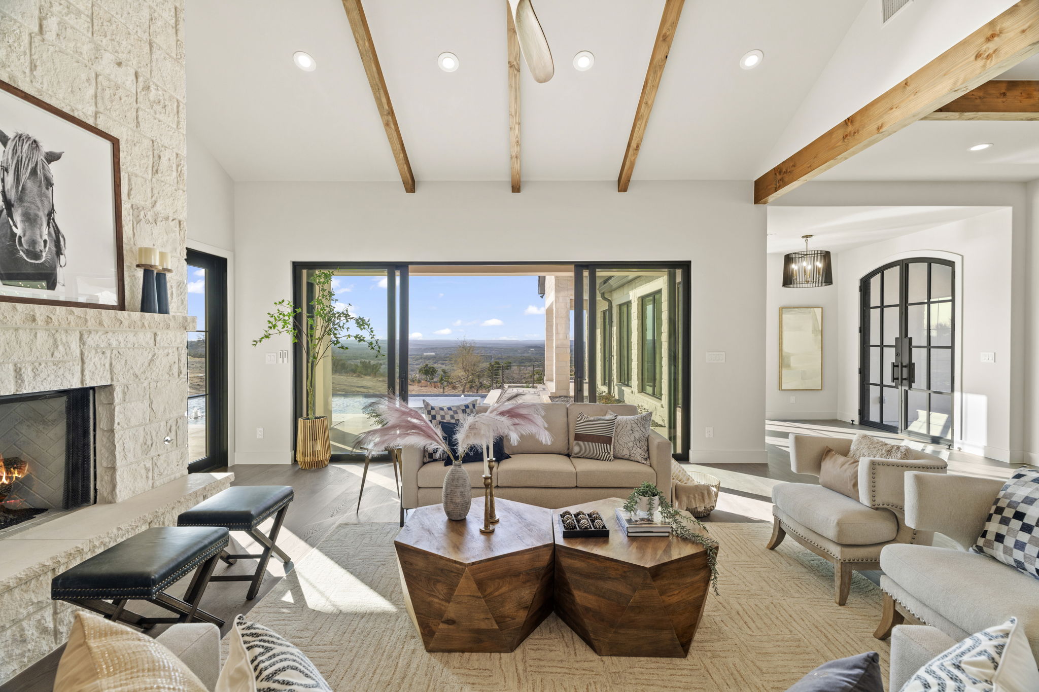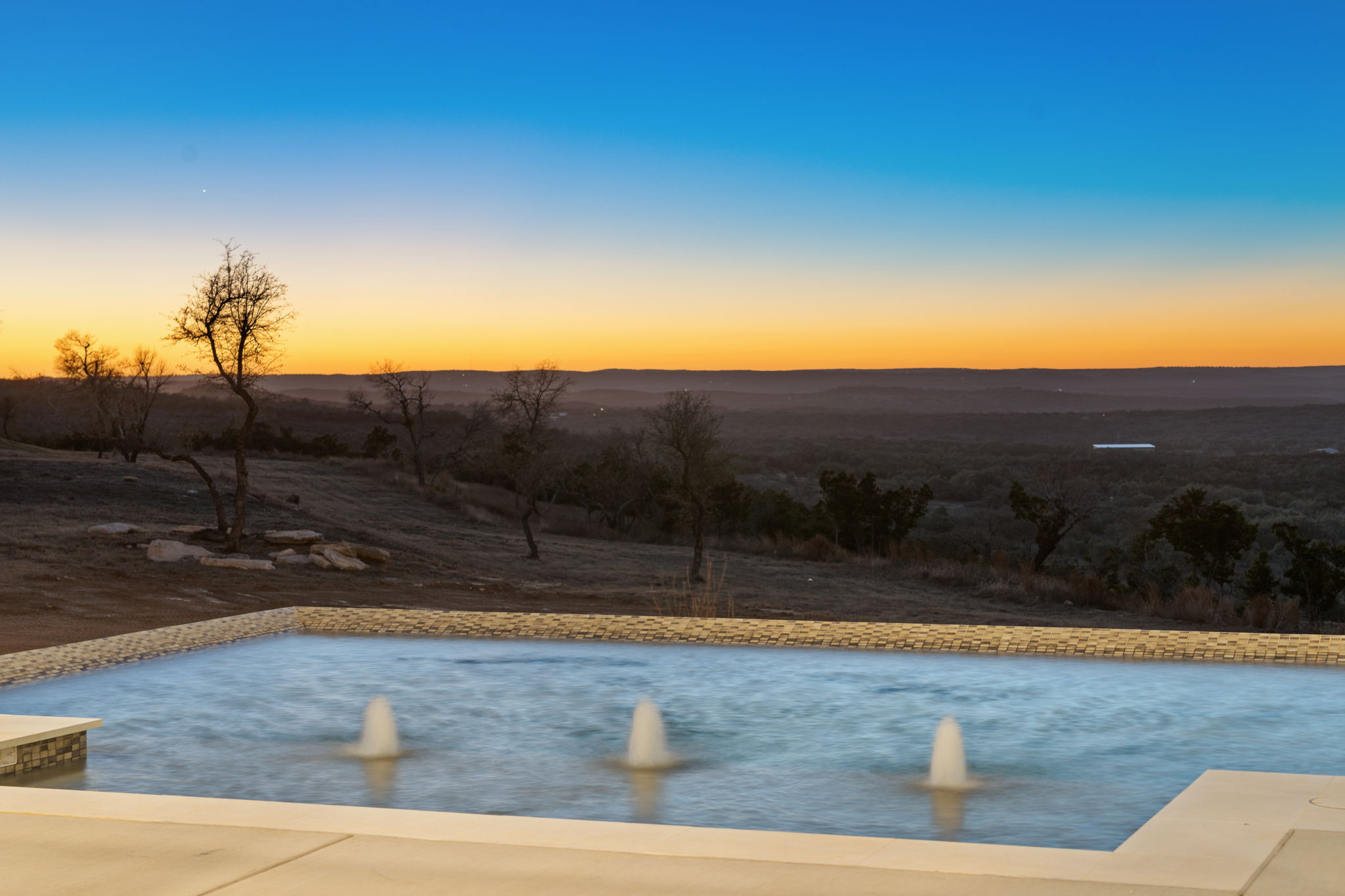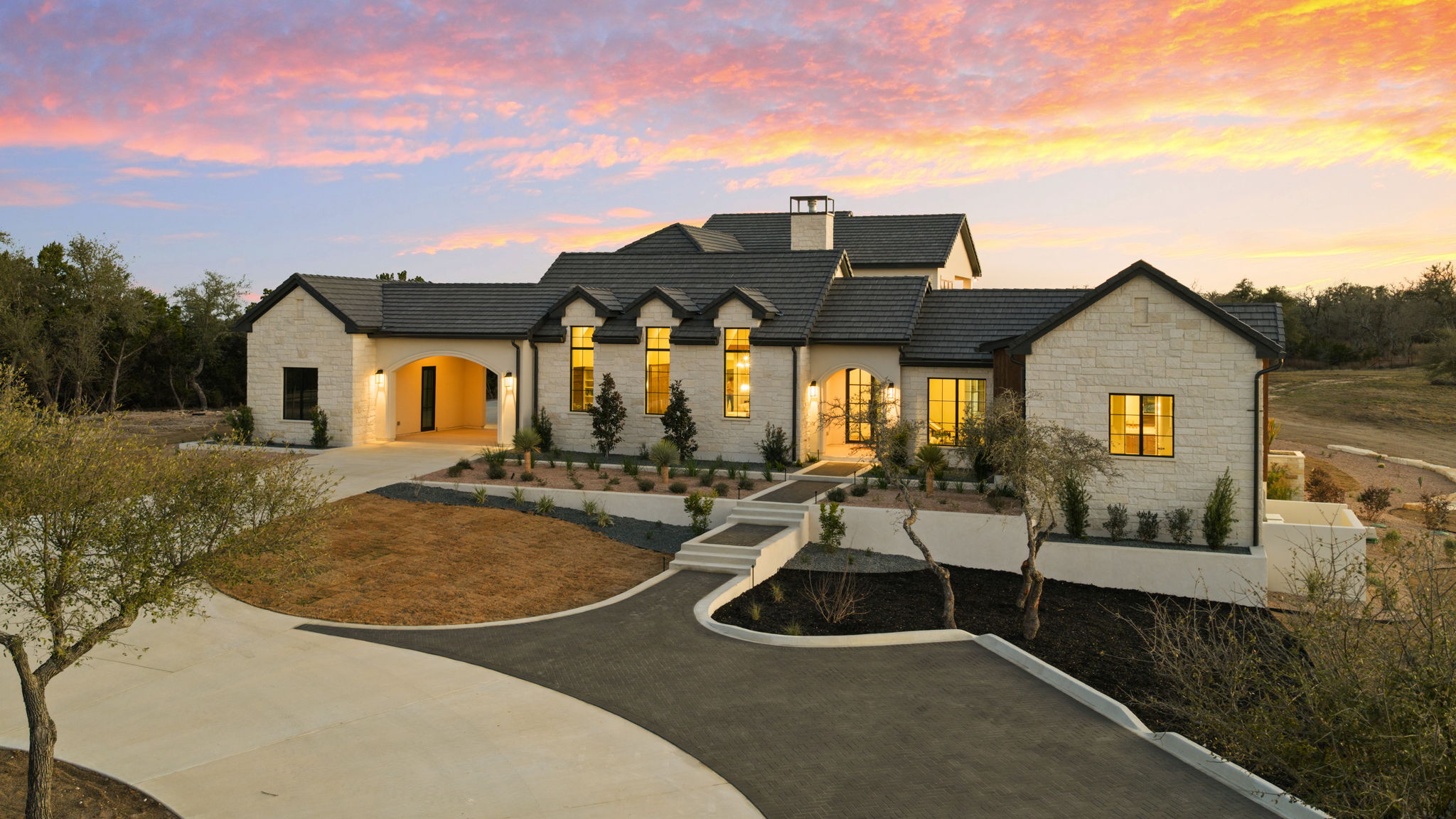 Nestled amid iconic Texas landscapes, this expansive estate harmoniously embraces its surroundings—offering panoramic epic views, sweeping open spaces, a tranquil grotto, and the gentle whisper of a seasonal creek.
