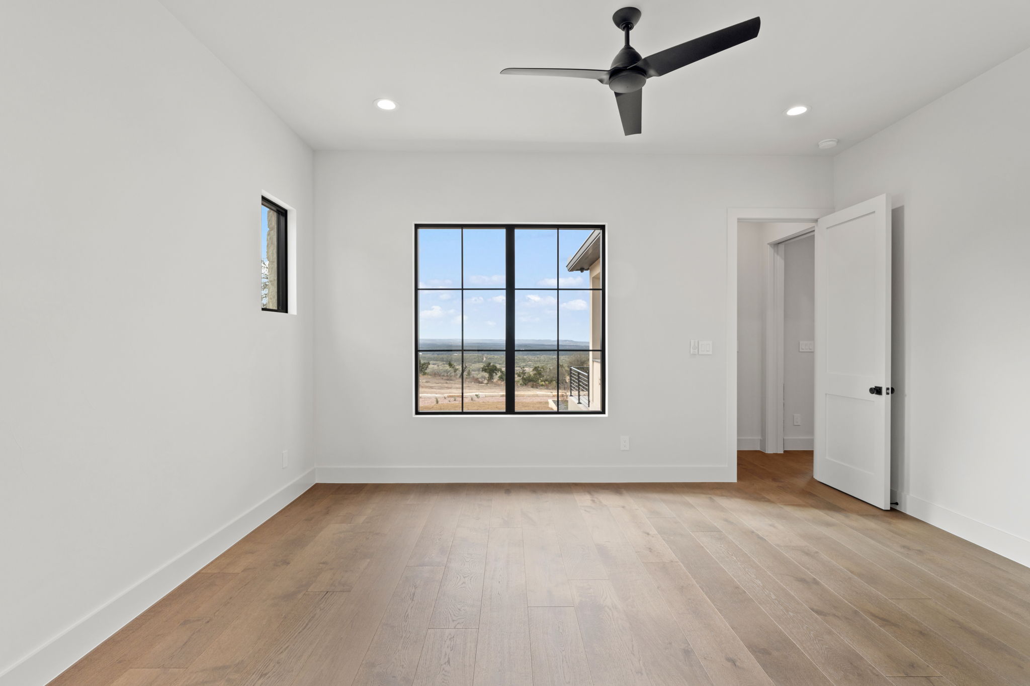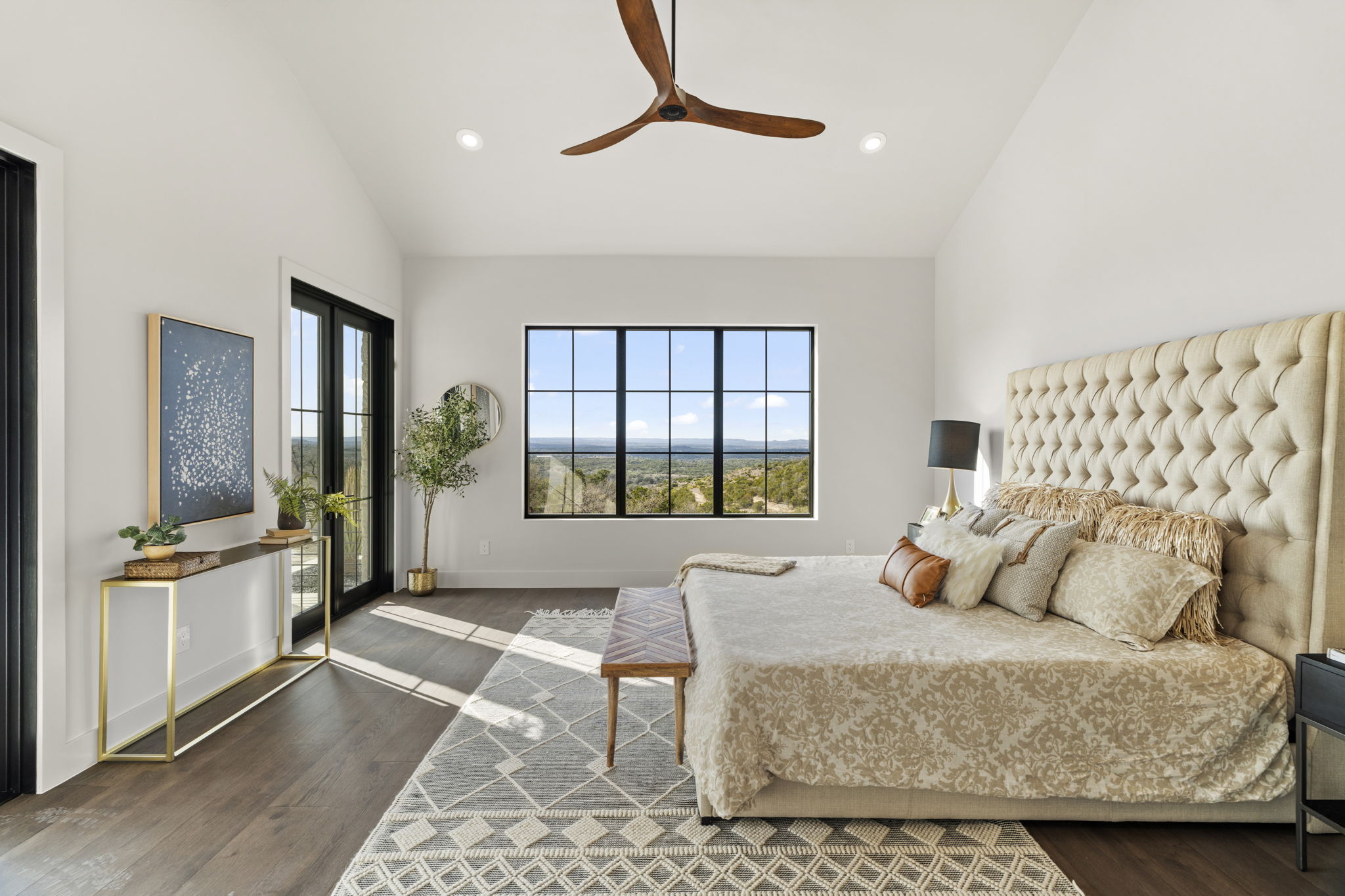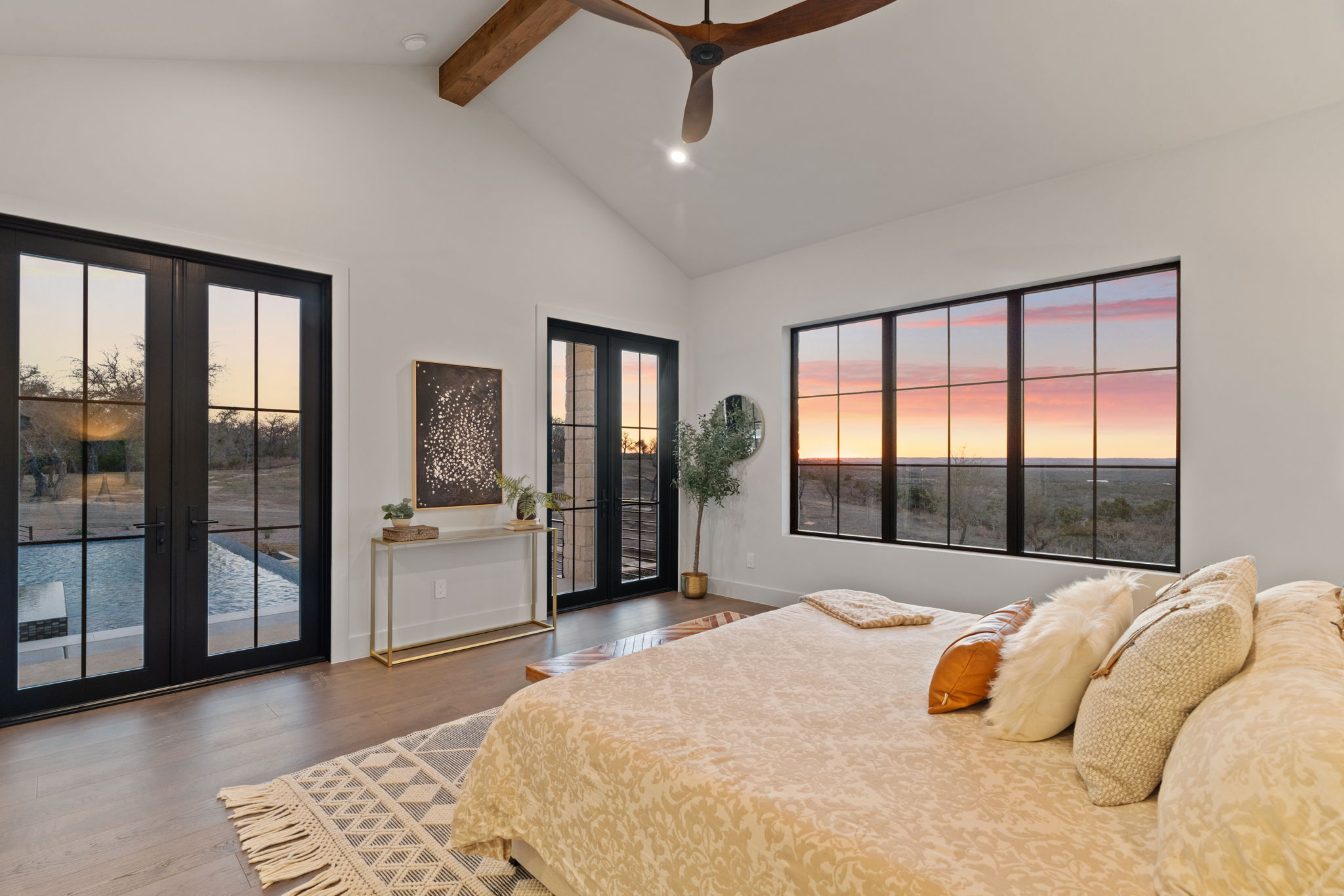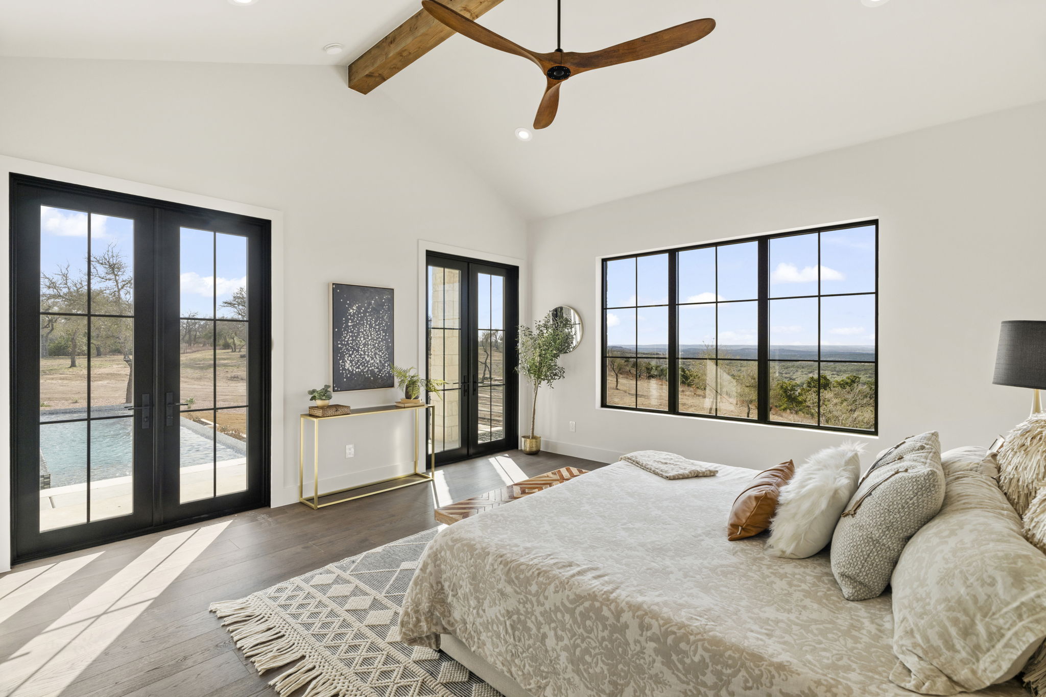 The primary suite is a true sanctuary: the master bedroom opens directly onto the expansive outdoor living area, inviting effortless indoor-outdoor flow and morning coffee with stunning Hill Country vistas. The indulgent master bath features his-and-hers walk-in closets, breathtaking custom cabinetry, spa-like sophistication, and large windows framing serene panoramic views that make every moment feel elevated.