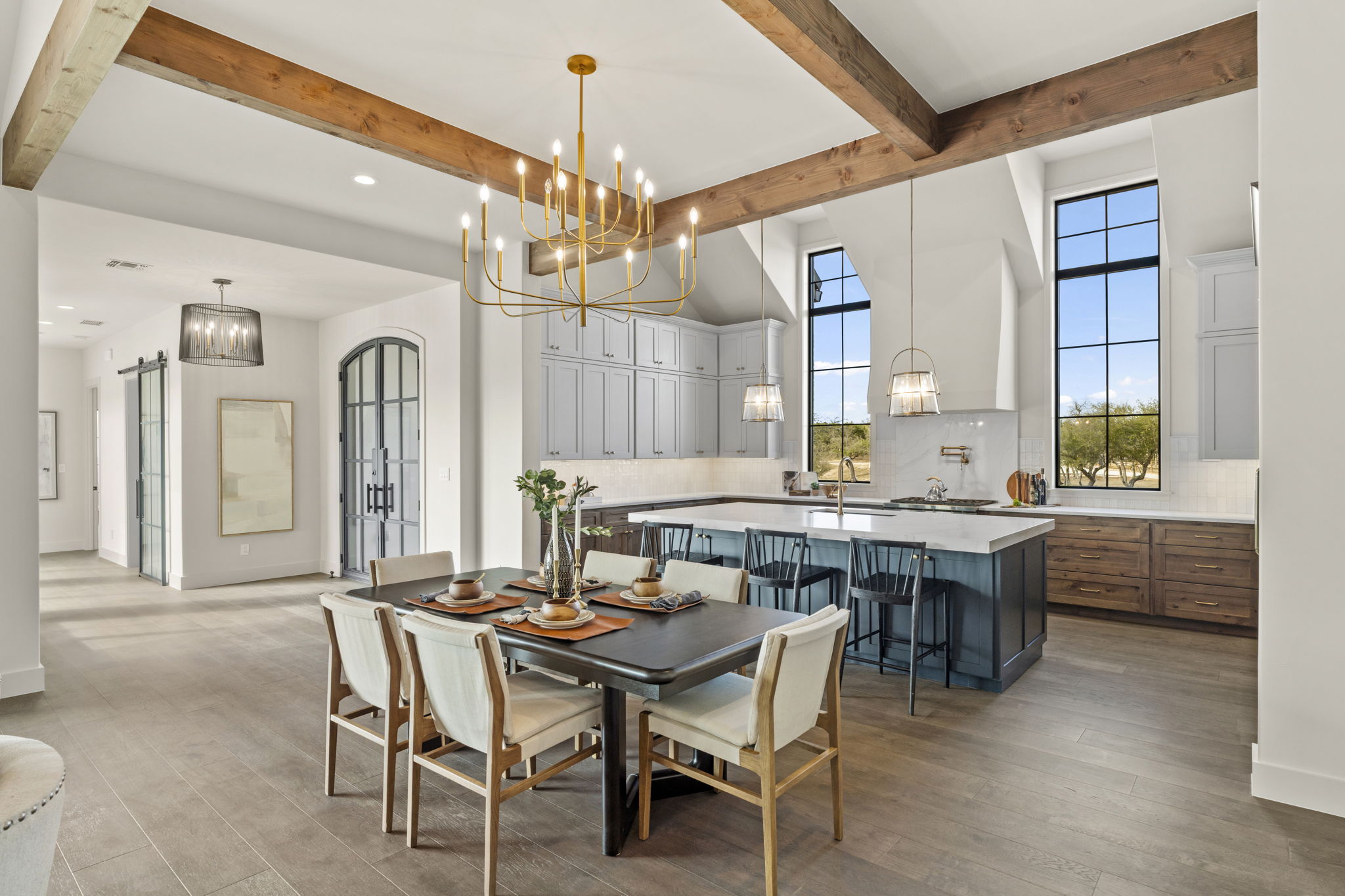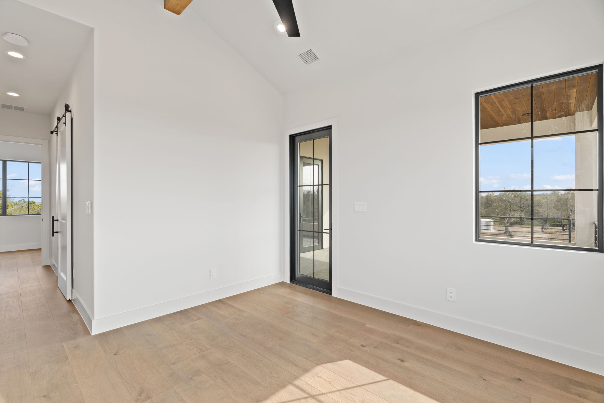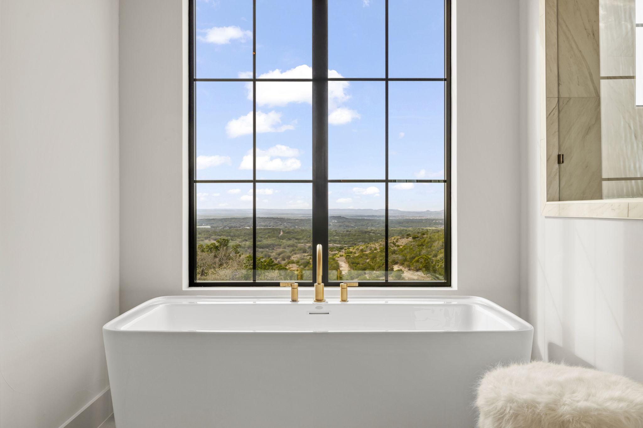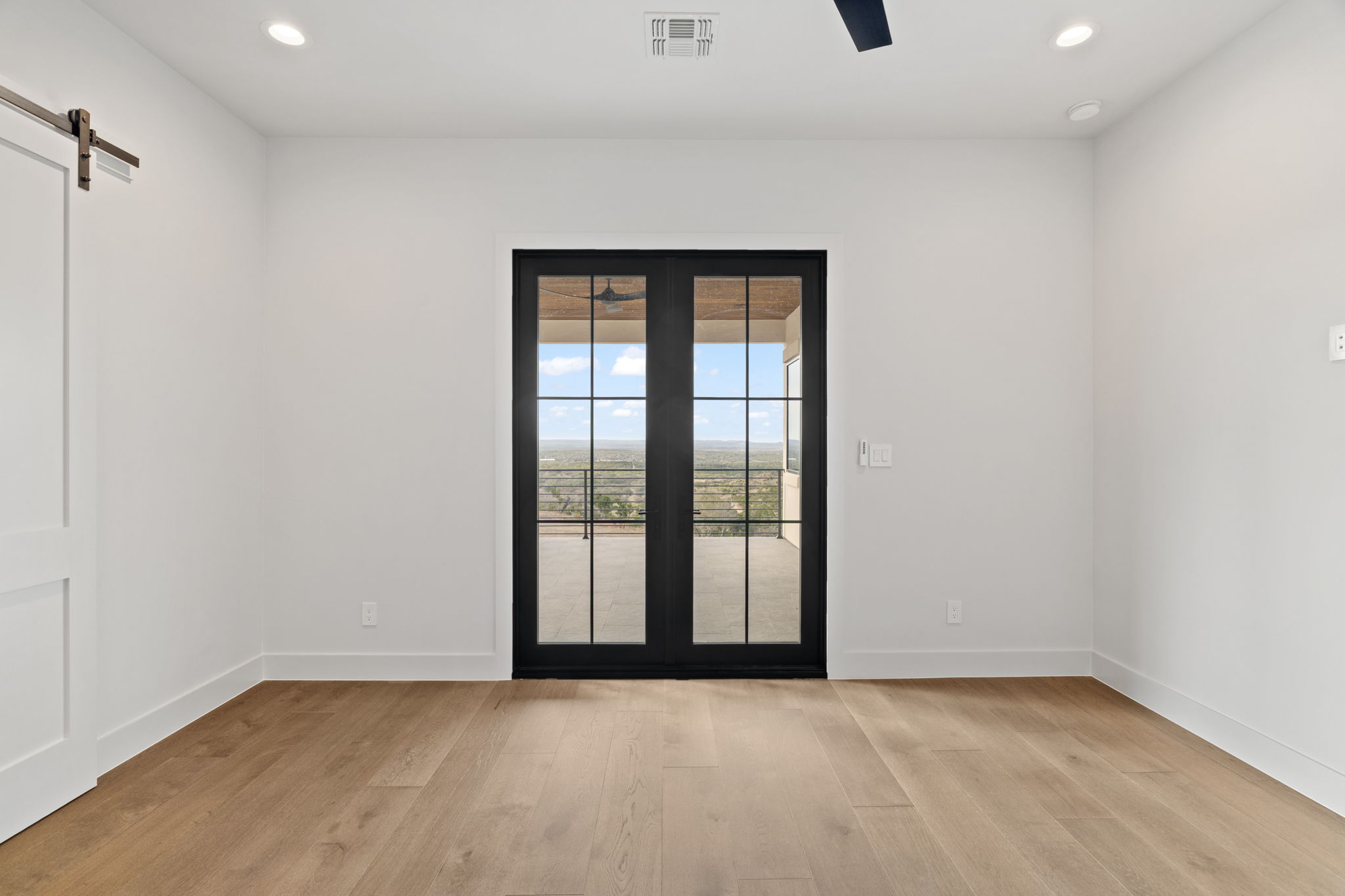 The primary suite is a true sanctuary: the master bedroom opens directly onto the expansive outdoor living area, inviting effortless indoor-outdoor flow and morning coffee with stunning Hill Country vistas. The indulgent master bath features his-and-hers walk-in closets, breathtaking custom cabinetry, spa-like sophistication, and large windows framing serene panoramic views that make every moment feel elevated.