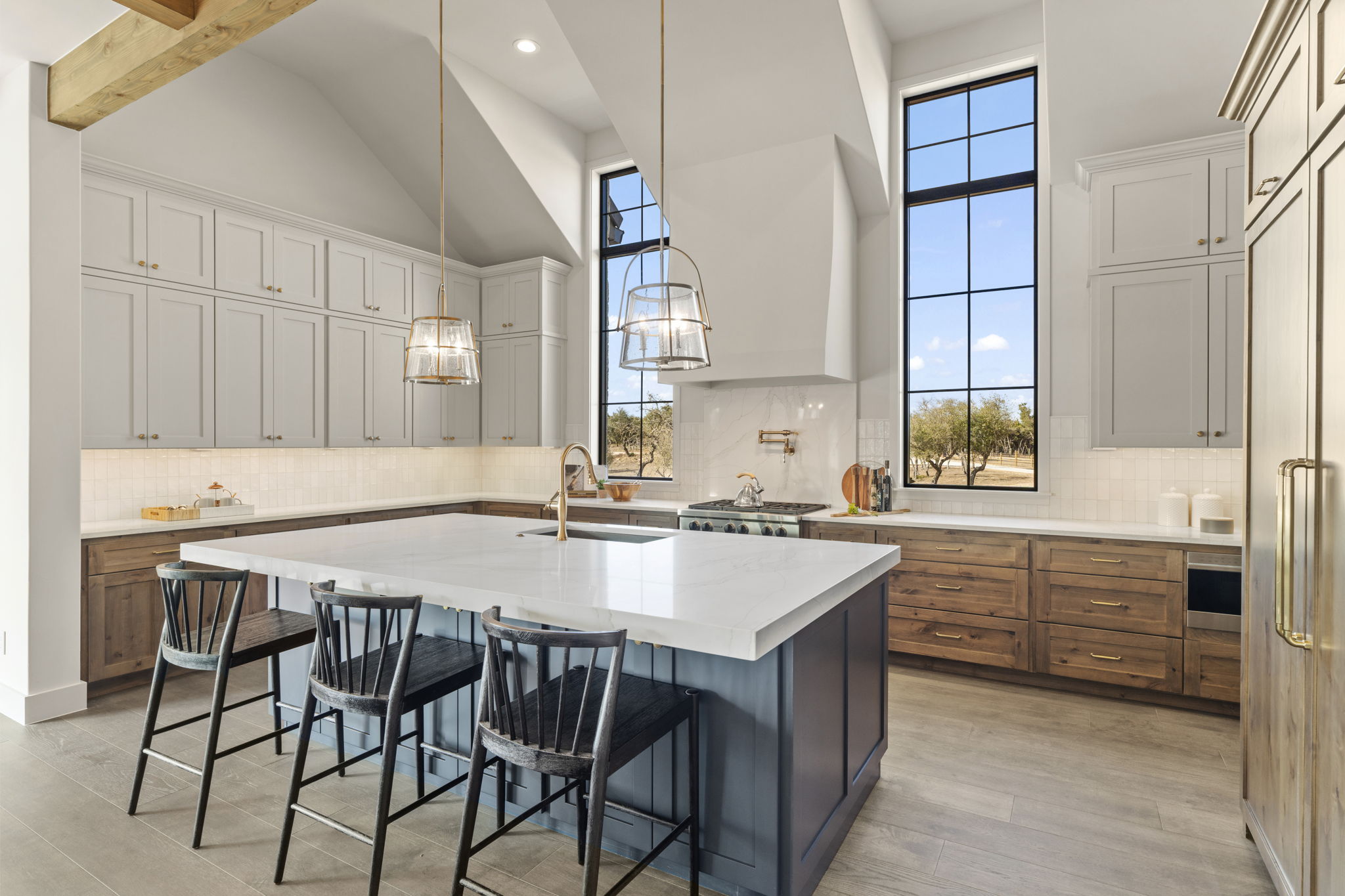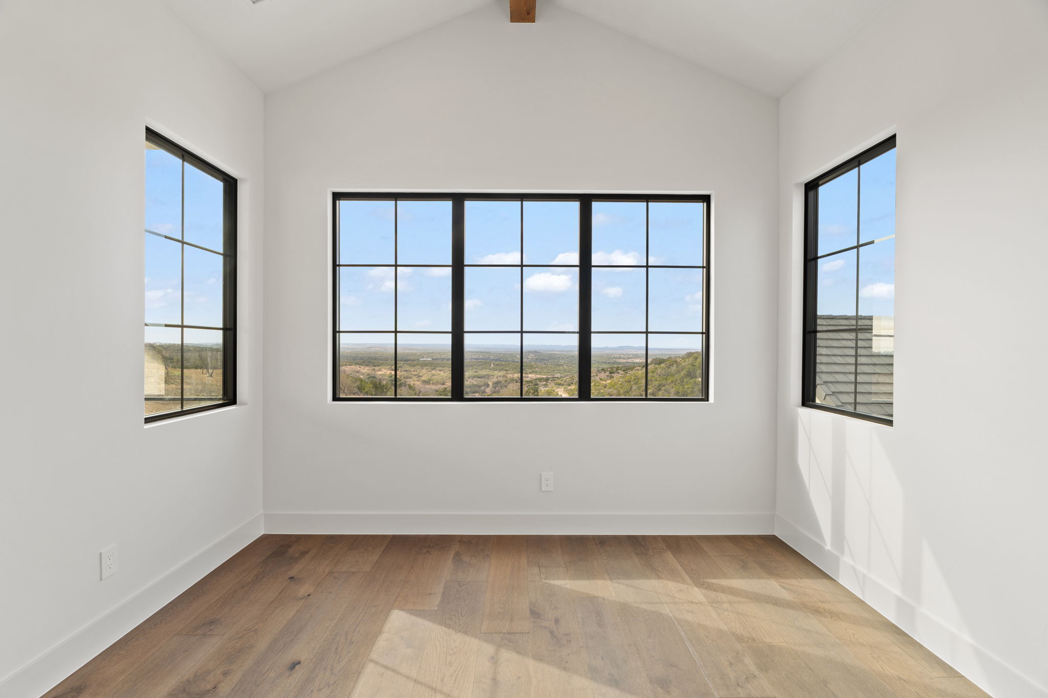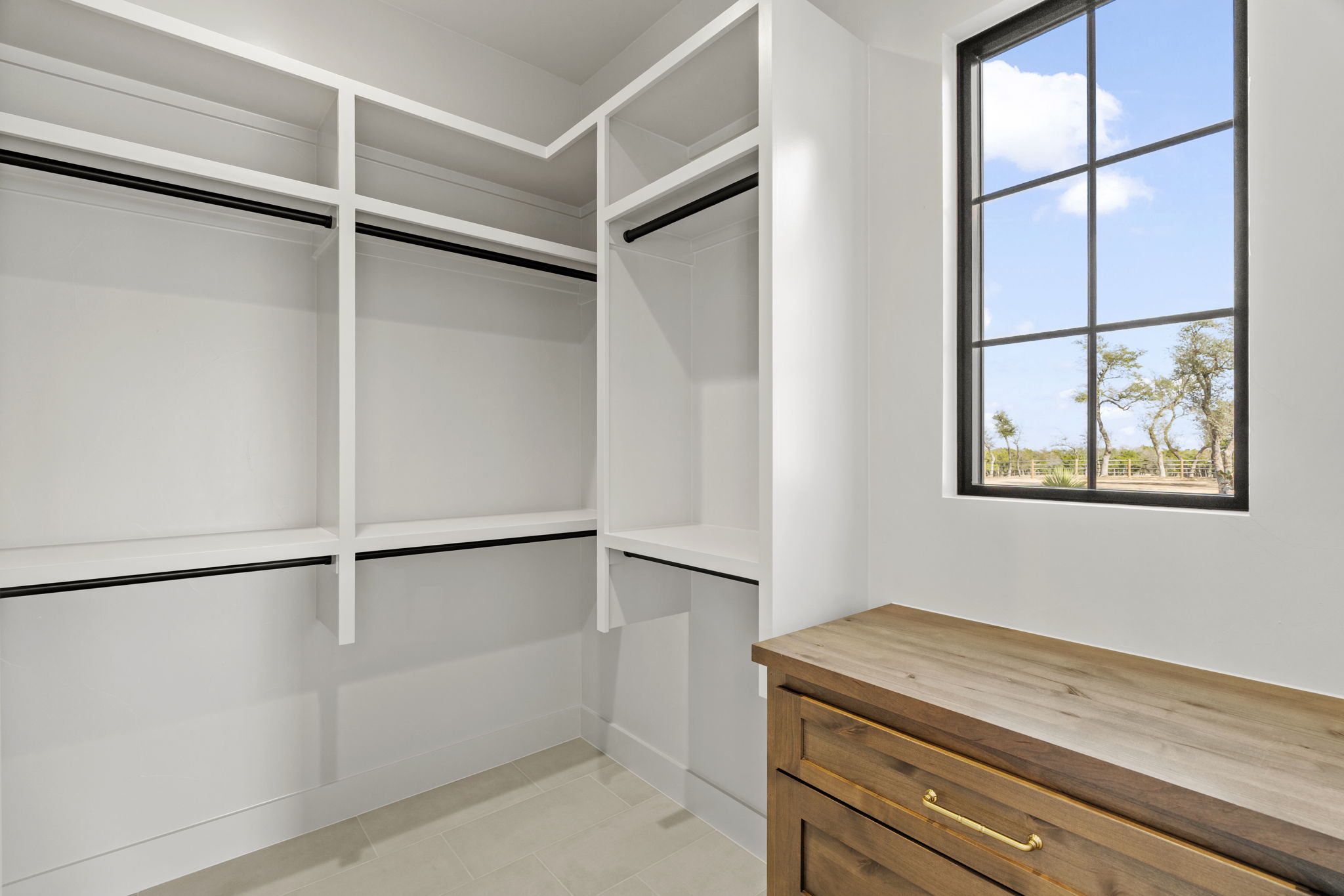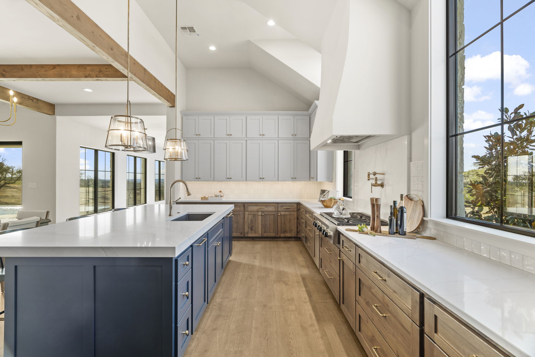 The primary suite is a true sanctuary: the master bedroom opens directly onto the expansive outdoor living area, inviting effortless indoor-outdoor flow and morning coffee with stunning Hill Country vistas. The indulgent master bath features his-and-hers walk-in closets, breathtaking custom cabinetry, spa-like sophistication, and large windows framing serene panoramic views that make every moment feel elevated.