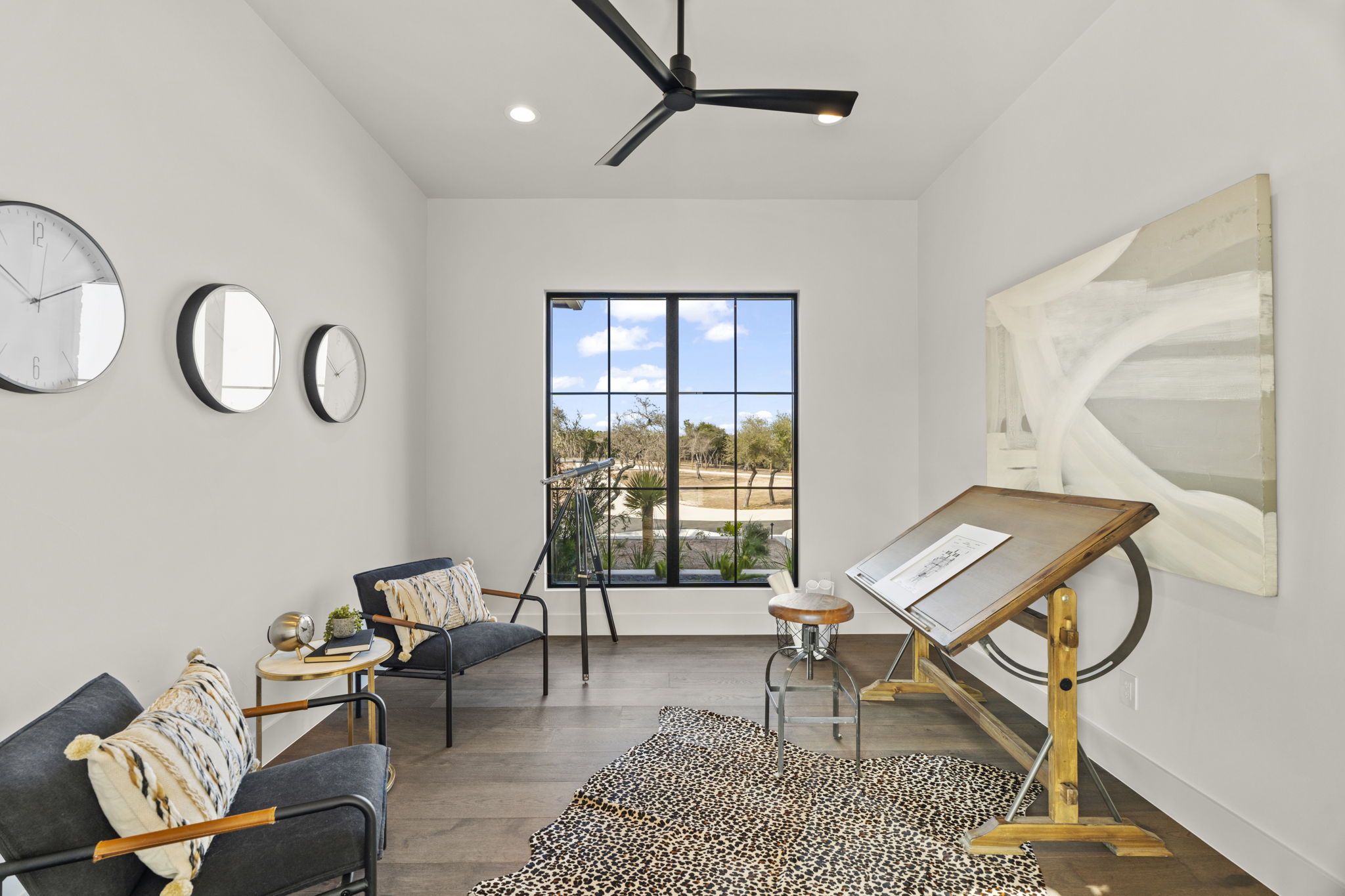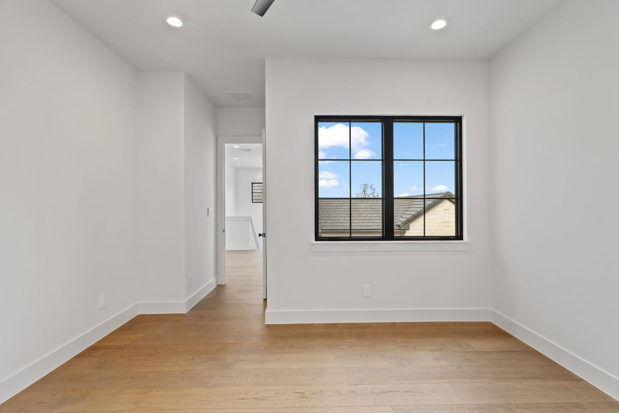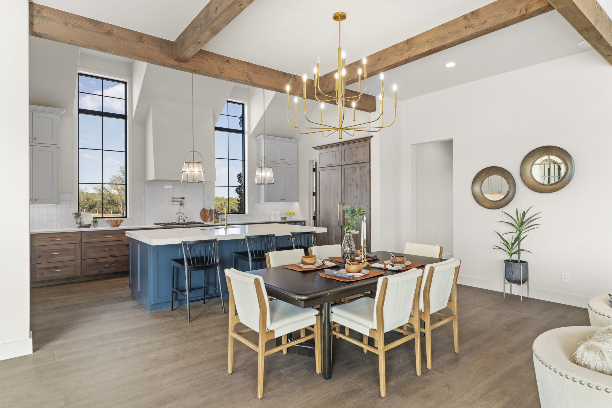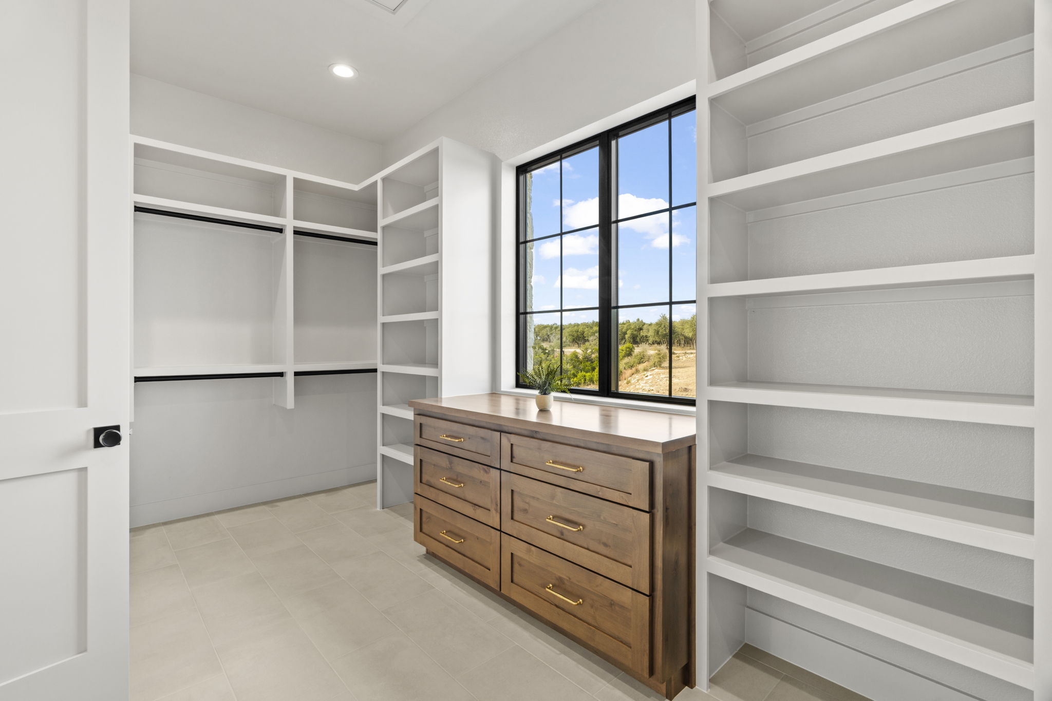 The primary suite is a true sanctuary: the master bedroom opens directly onto the expansive outdoor living area, inviting effortless indoor-outdoor flow and morning coffee with stunning Hill Country vistas. The indulgent master bath features his-and-hers walk-in closets, breathtaking custom cabinetry, spa-like sophistication, and large windows framing serene panoramic views that make every moment feel elevated.
