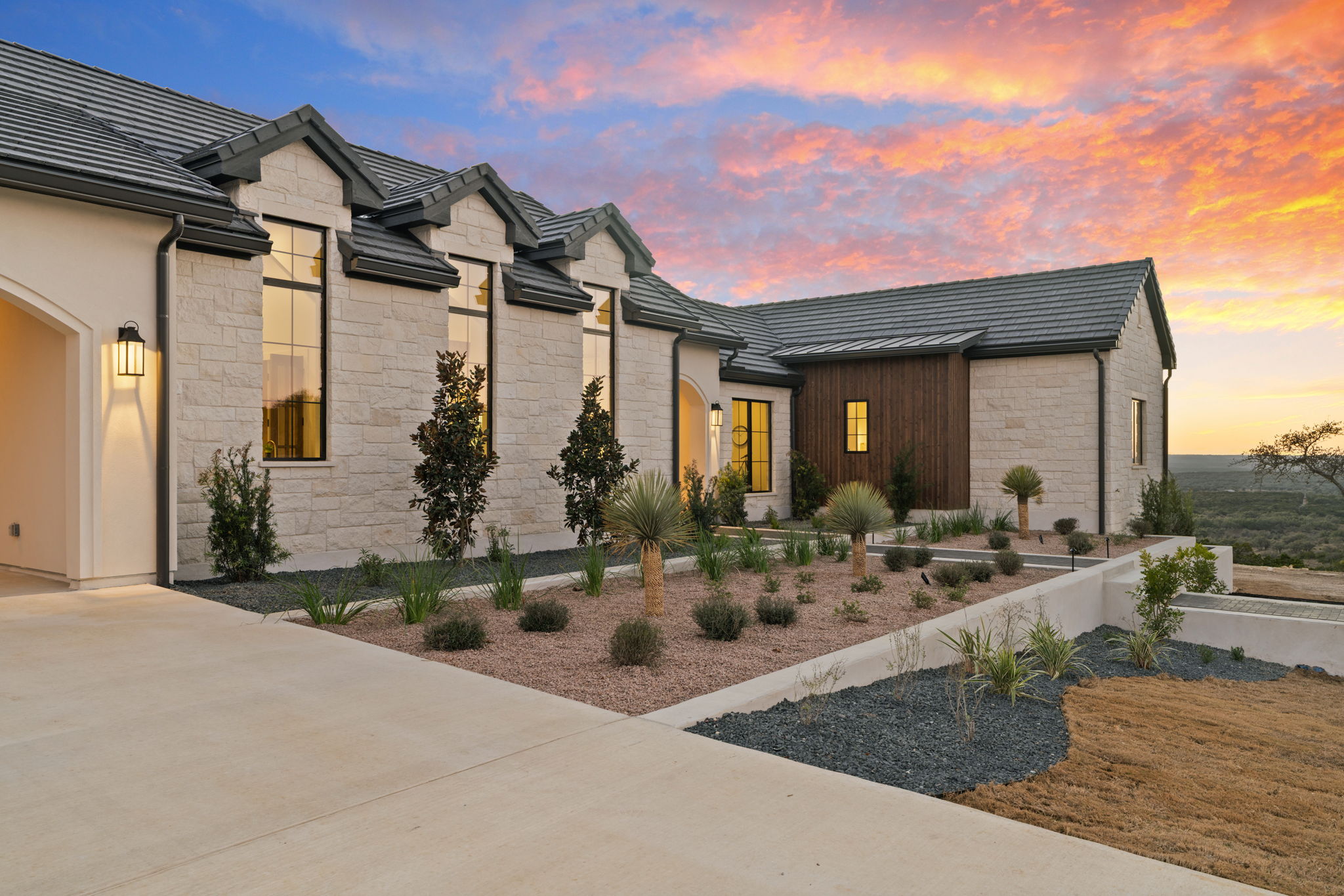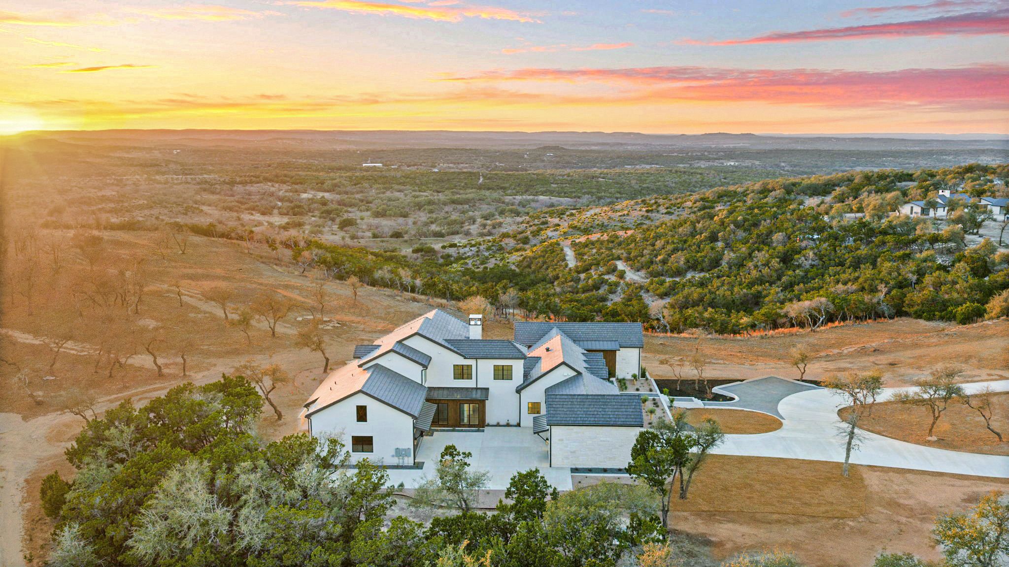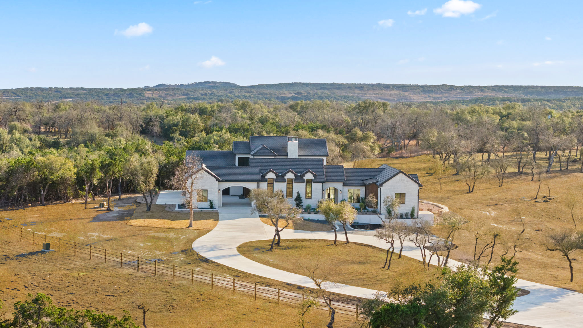 Nestled amid iconic Texas landscapes, this expansive estate harmoniously embraces its surroundings—offering panoramic epic views, sweeping open spaces, a tranquil grotto, and the gentle whisper of a seasonal creek.