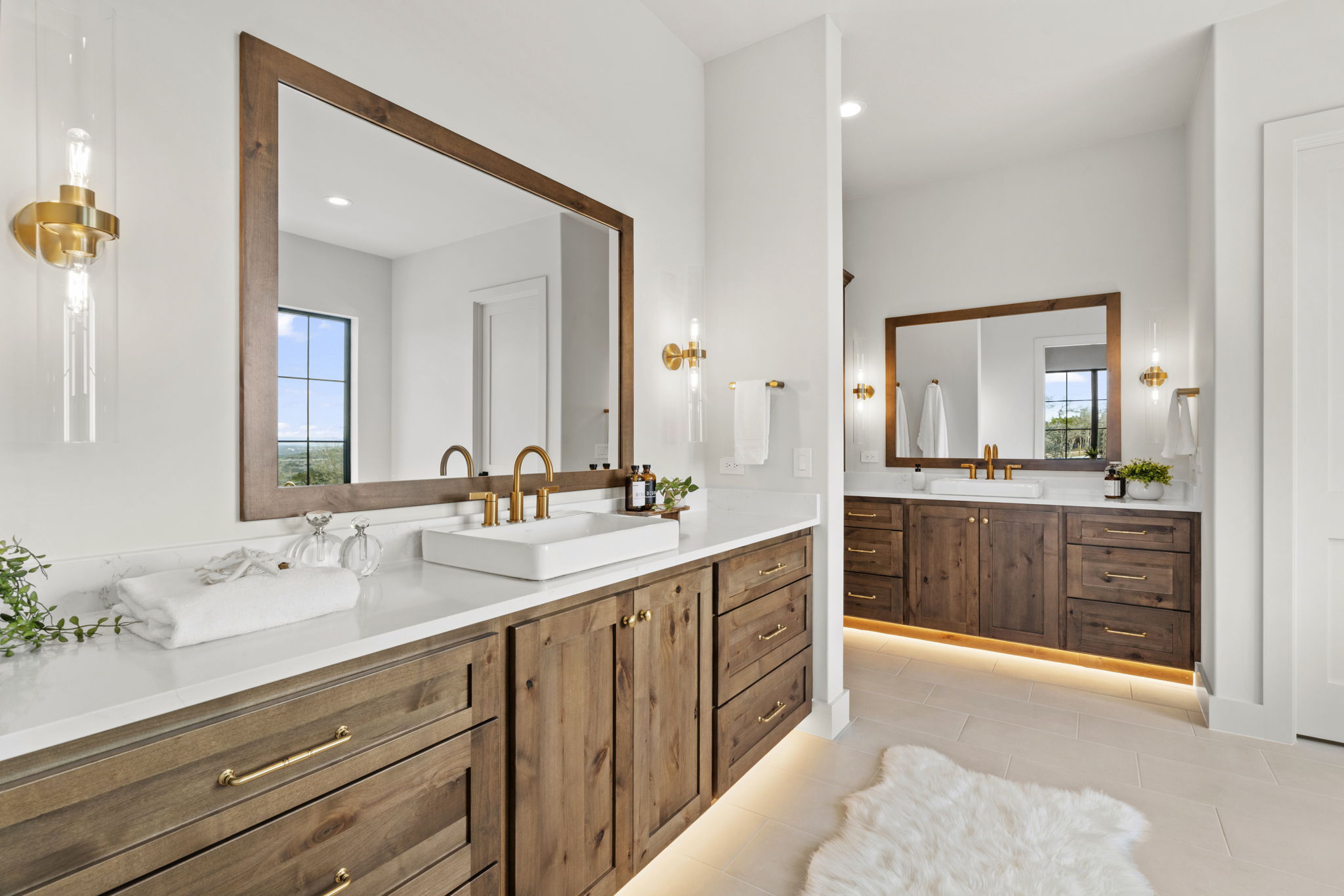 The primary suite is a true sanctuary: the master bedroom opens directly onto the expansive outdoor living area, inviting effortless indoor-outdoor flow and morning coffee with stunning Hill Country vistas. The indulgent master bath features his-and-hers walk-in closets, breathtaking custom cabinetry, spa-like sophistication, and large windows framing serene panoramic views that make every moment feel elevated.